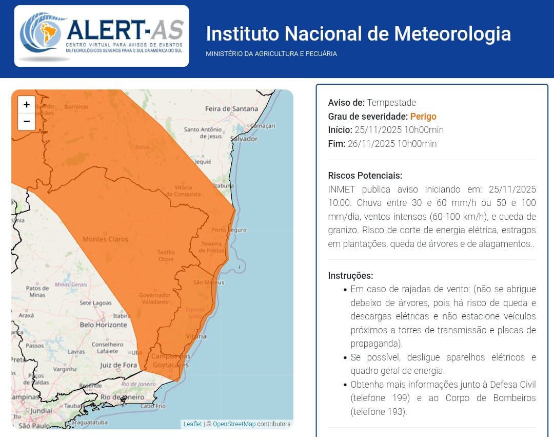 O município de Vitória da Conquista foi inserido, nesta terça-feira (25), na área de Alerta Laranja com perigo de tempestade, conforme publicação do Instituto Nacional de Meteorologia (Inmet).