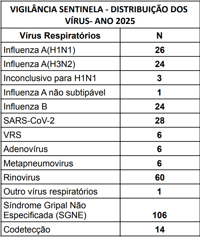 Também foram identificados casos de Vírus Sincicial Respiratório e Influenza B, demonstrando a importância da vigilância para o diagnóstico diferencial das doenças respiratórias.