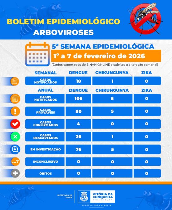 A Prefeitura de Vitória da Conquista divulgou nesta sexta-feira (13) o Boletim das Arboviroses com 19 notificações. O monitoramento foi realizado pela Secretaria Municipal de Saúde (SMS), com auxílio da Coordenação de Vigilância Epidemiológica (Viep), e reflete a 5ª Semana Epidemiológica, em que foram analisados os dados desde o dia primeiro até sete de fevereiro de 2026.