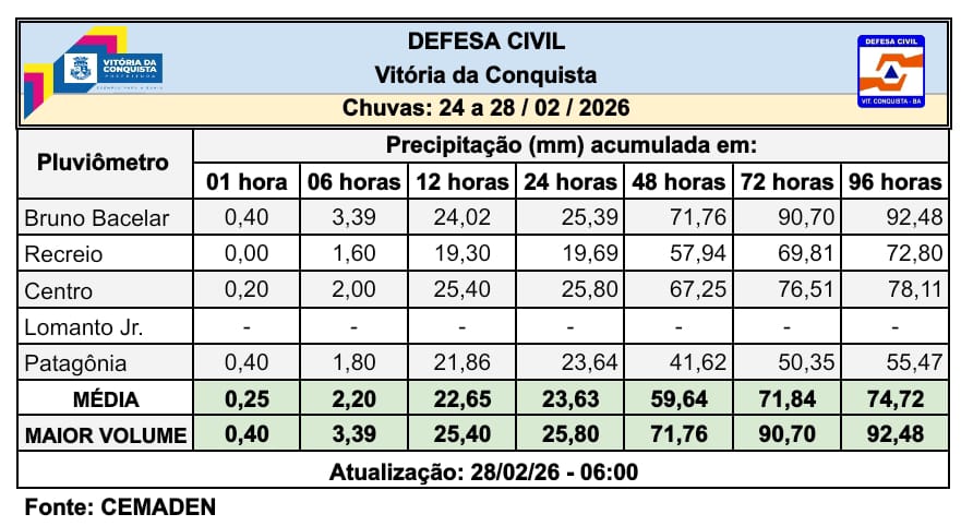 Vitória da Conquista encerrou o mês de fevereiro com índices pluviométricos atípicos. Até a última sexta-feira (27), o município havia registrado um acumulado de 200,74 mm de chuva. O volume representa mais do que o triplo da média da série histórica para o mês, calculada em 64,5 mm pelo Instituto Nacional de Meteorologia (Inmet). Em comparação com fevereiro de 2025, quando choveu apenas 26,31 mm, o índice atual é quase dez vezes maior.