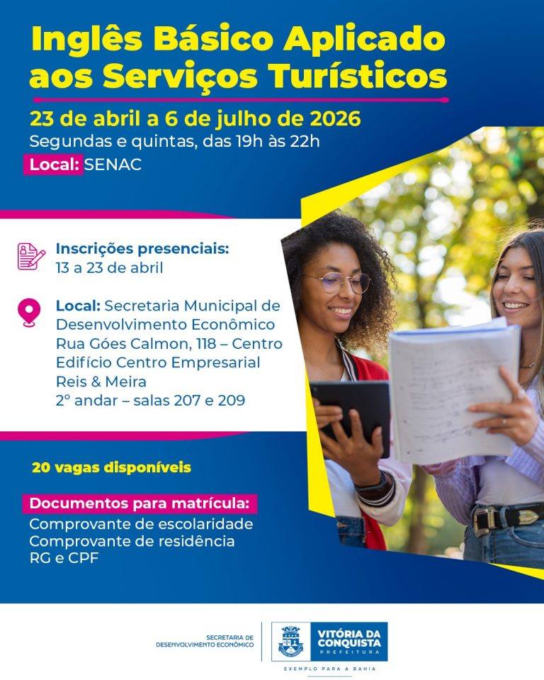 A Prefeitura de Vitória da Conquista anunciou abertura de inscrições para cursos de qualificação profissional na área do turismo. A iniciativa é realizada em parceria com a Secretaria de Turismo da Bahia (Setur) e o Serviço Nacional de Aprendizagem Comercial, com o objetivo de fortalecer o setor e ampliar as oportunidades de emprego no município.