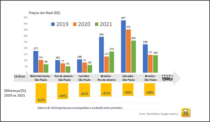 O levantamento inédito analisou as rotas entre as capitais mais buscadas no site do metabuscador de viagens de ônibus, comparando os anos completos de 2019 com 2021. São elas: Belo Horizonte (MG) - São Paulo (SP), Rio de Janeiro (RJ) - São Paulo (SP), Curitiba (PR) - São Paulo (SP), Brasília (DF) - Rio de Janeiro (RJ), Salvador (BA) - São Paulo (SP) e Brasília (DF) - São Paulo (SP). A conclusão é de que os valores médios das passagens nessas linhas tiveram uma redução que varia de 38% (entre a capital federal e São Paulo) até 61% de queda, na linha que liga BH à capital paulista.