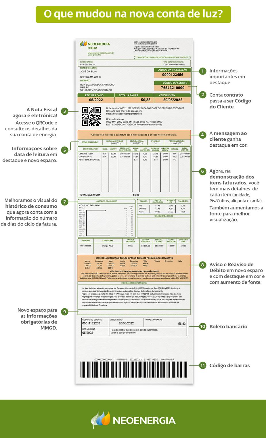 A nova conta de luz traz mais informações sobre o consumo de cada unidade, o valor das tarifas — Tarifa de Energia (TE) e Tarifa de Uso do Sistema de Distribuição (TUSD) — e os impostos — PIS/Cofins, que são federais, e ICMS, estadual. Esses dados antes eram apresentados em três colunas e agora são mostrados em dez, de maneira mais detalhada. Além disso, há um QR Code que pode ser utilizado para verificar a autenticação digital.