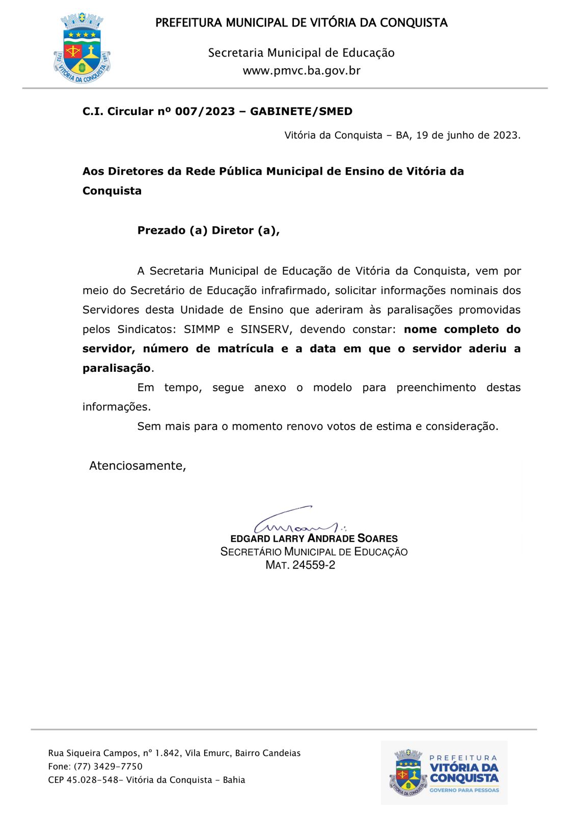 Um documento com a assinatura do secretário de Educação, Edgard Larry, e que tem circulado em grupos de professores da rede municipal, solicita às diretoras e aos diretores das escolas de Vitória da Conquista informações sobre profissionais da educação que têm aderido às paralisações que ocorrem desde meados de maio na rede pública de ensino municipal.