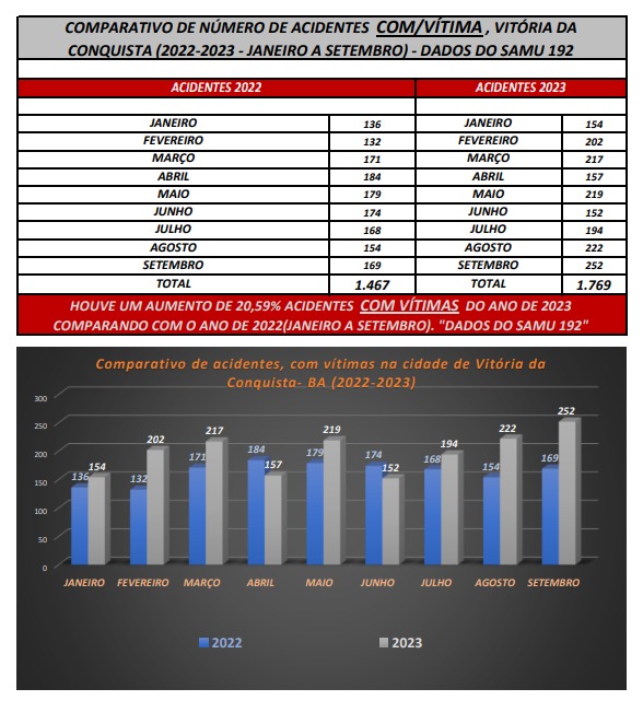 Em 2022 foram registrados pelo Serviço Móvel de Urgência (Samu 192) 1.467 acidentes com vítimas. Em 2023, esses números subiram para 1.769 acidentes com vítimas.