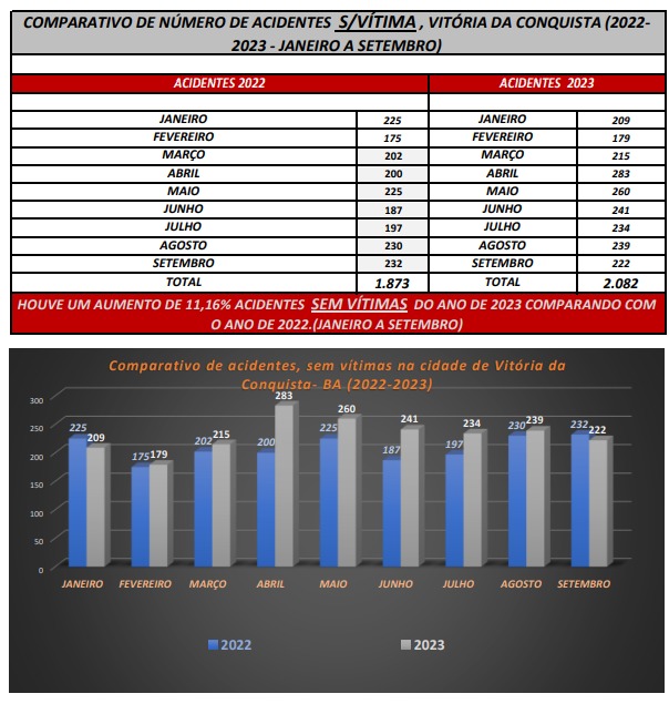 Já os acidentes sem vítima, foram registrados 1.873 em 2022, e 2.082 acidentes em 2023. O aumento foi de 11,16%, segundo o Simtrans.