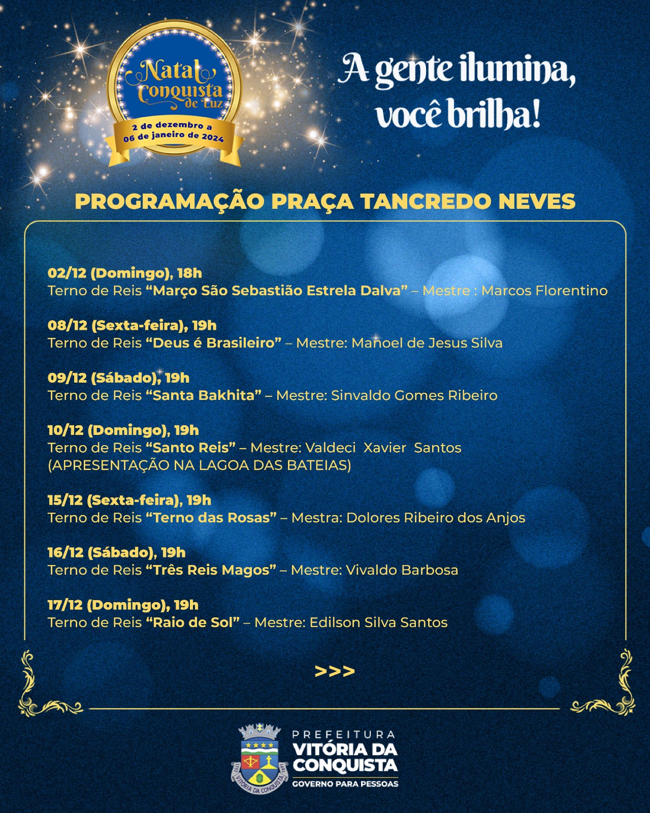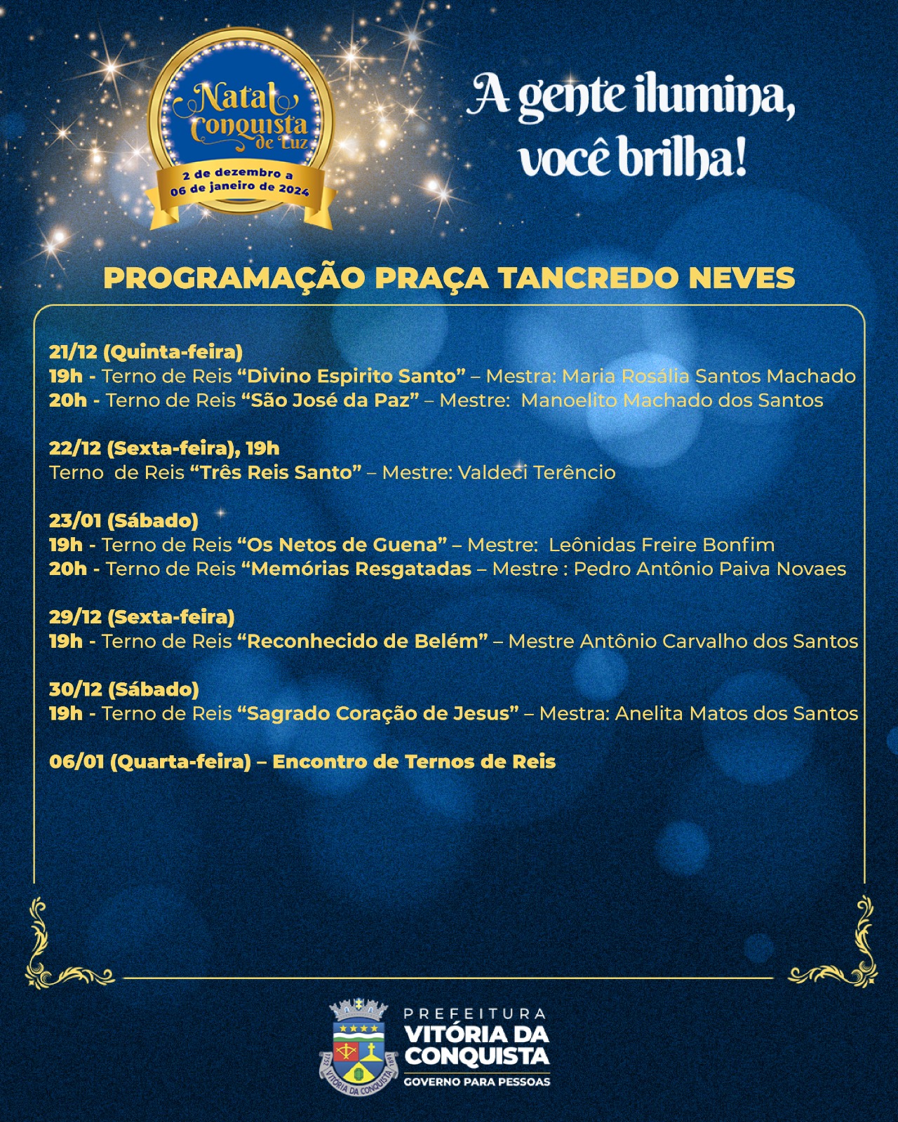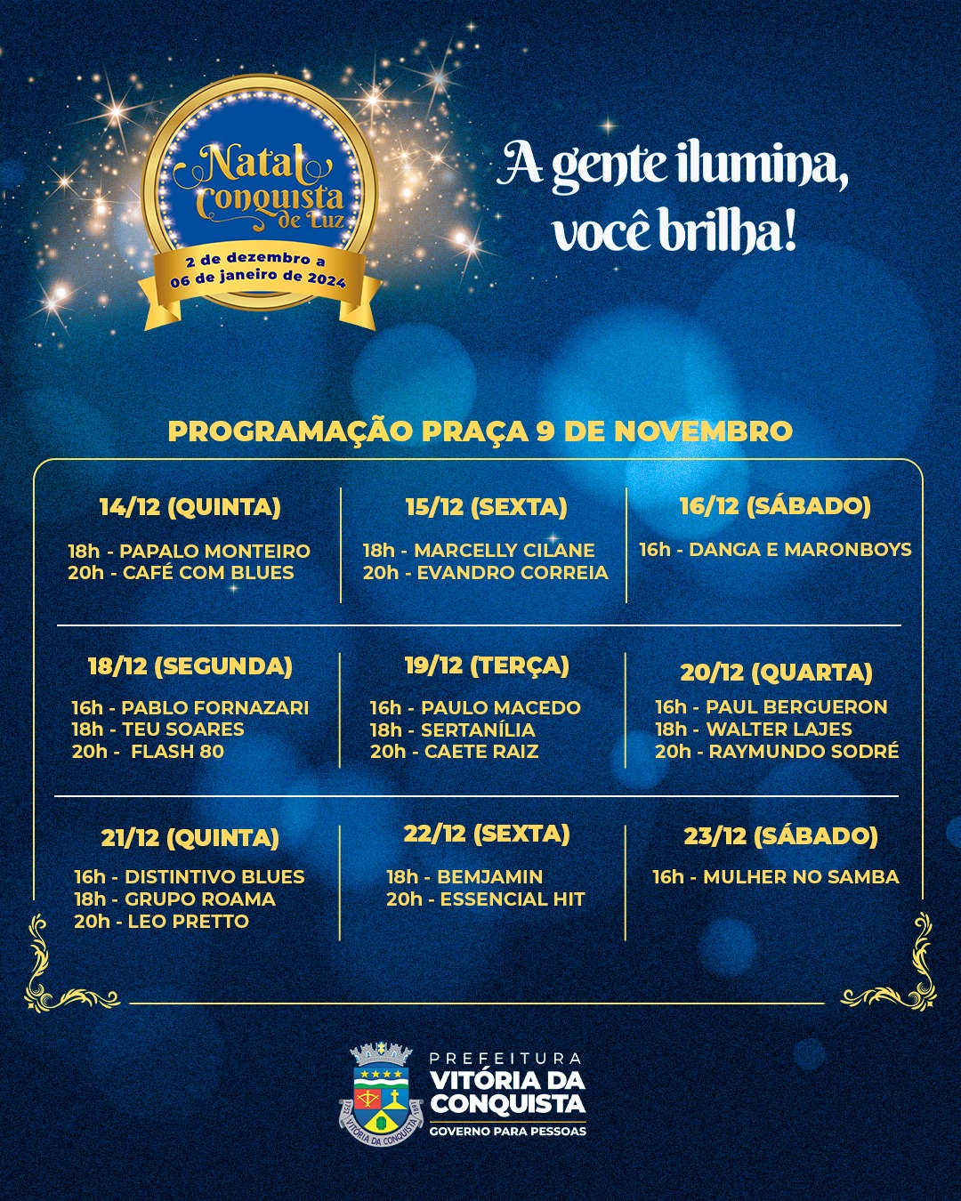 A Prefeitura Municipal de Vitória da Conquista anunciou nessa terça-feira (12) a programação oficial das apresentações durante o Natal Conquista de Luz. Os shows acontecerão entre os dias 14 e 23 deste mês nas Praças Nove de Novembro e Tancredo Neves e serão realizados por artistas locais.