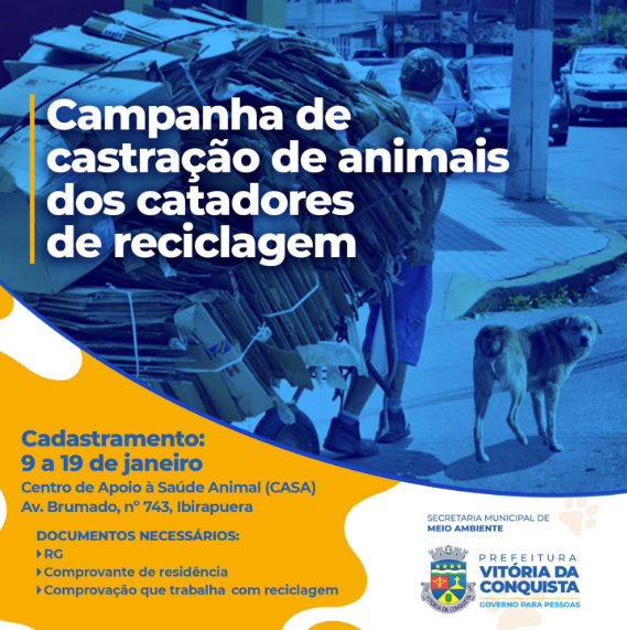 A partir desta terça-feira (9), a Prefeitura de Vitória da Conquista dará início a uma campanha com foco na castração de cães e gatos que estejam sob os cuidados de pessoas que trabalham como catadores de materiais recicláveis. A iniciativa, que acontece de forma gratuita, vai até o dia 19 de janeiro.