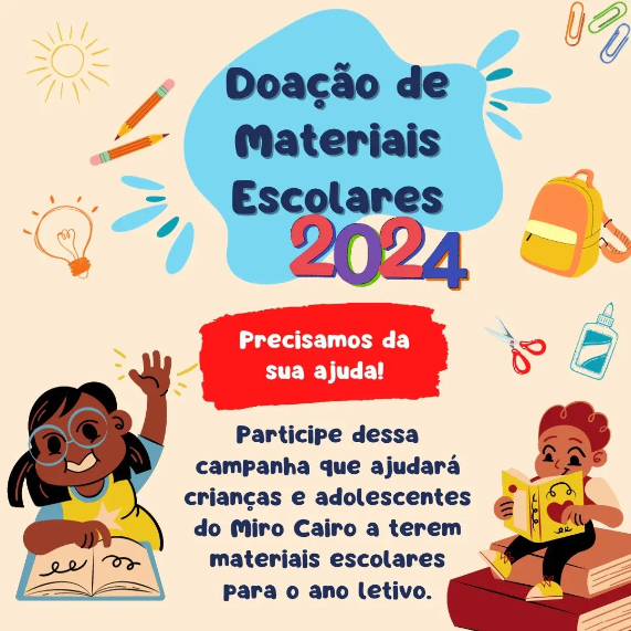 A Biblioteca Comunitária Miro Cairo começou nesse domingo (14) uma campanha para arrecadar materiais escolares para crianças. Serão recolhidos materiais novos, mas também serão aceitos usados caso estejam em bom estado.