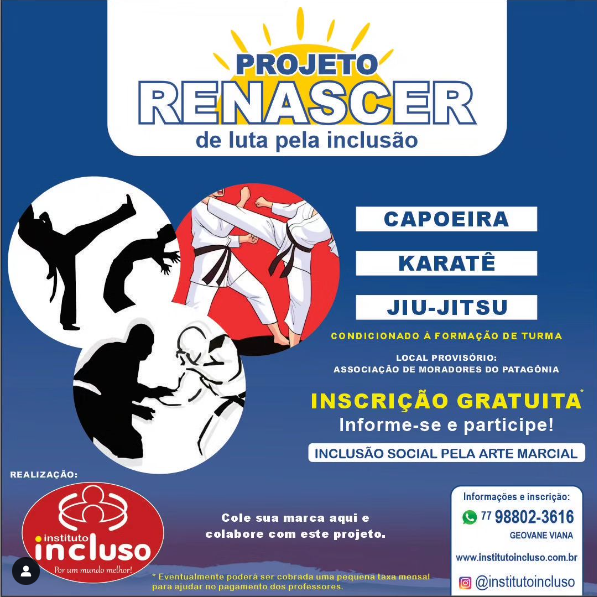 No sábado, o Instituto Incluso começou um projeto de inclusão social por meio das artes marciais. A iniciativa, chamada de “Projeto Renascer”, visa montar turmas de capoeira, karatê e jiu-jitsu com os propósitos de aliar a prática do esporte com a responsabilidade social e trazer oportunidades para pessoas que não possuem condições de pagar por aulas.