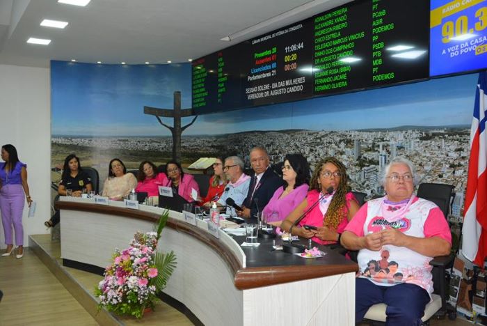 A Sessão também foi espaço para o movimento da Marcha das Mulheres de Vitória da Conquista, onde a ex-vereadora Nildma Ribeiro falou no púlpito sobre a falta de cargos ocupados por mulheres na política e na sociedade.