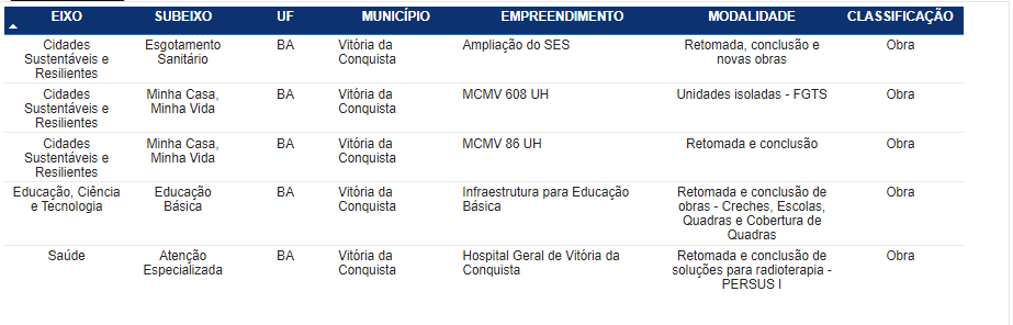 Na última quinta-feira (7), o presidente Luís Inácio Lula da Silva (PT) havia anunciado os projetos de estados e municípios contemplados na modalidade Novo Programa de Aceleração do Crescimento (PAC) Seleções. Para Vitória da Conquista, sete projetos dos eixos de “Educação, Ciência e Tecnologia”, “Infraestrutura Social e Inclusiva” e “Saúde” foram aprovados.