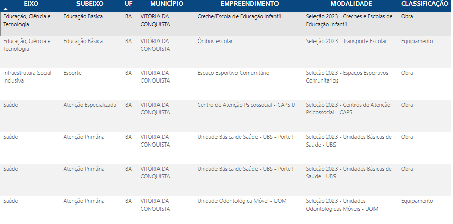 Na área de “Educação, Ciência e Tecnologia”, Vitória da Conquista vai receber Creche/escola de Educação Infantil e Ônibus Escolar. Já na modalidade de “Infraestrutura Social e Inclusiva”, o município foi contemplado com um Espaço Esportivo Comunitário. Com quatro projetos aprovados, o eixo “Saúde” vai receber um Centro de Atenção Psicossocial, duas Unidades Básicas de Saúde – UBS Porte I, e uma Unidade Odontológica Móvel.