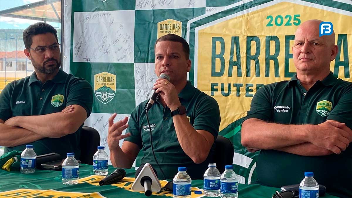 Fahel Júnior (à direita) é apresentado oficialmente como técnico do Barreiras Futebol Clube em coletiva no Estádio Municipal Geraldão | Foto: Osmar Ribeiro/Falabarreiras